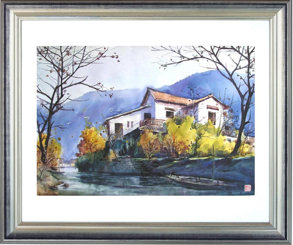 《渔庄秋色》运用水色表现了现代渔庄秋天自然意境